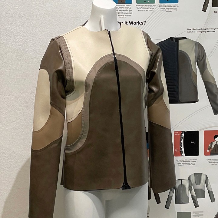A jacket designed for stress relief, providing confidence in self-soothing and discreet use anytime, anywhere in public, mainly for panic attacks.