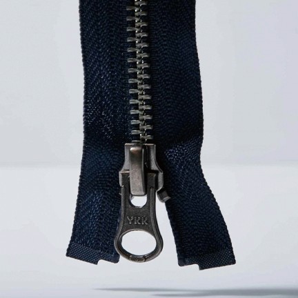 Low-impact metal and coil zippers made from recycled materials, featuring durable hardware and smooth one-way open-end construction.